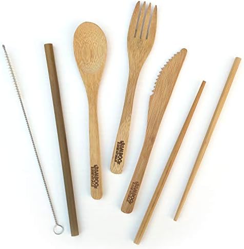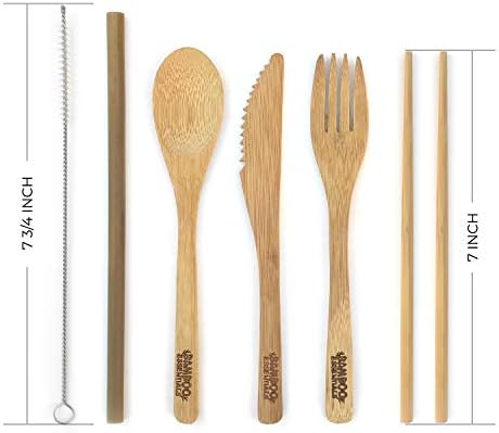 FULL SET INCLUDES: 1 Bamboo Fork, 1 Bamboo Corrugated Knife, 1 Bamboo Spoon, 2 Standard size Bamboo Chopsticks, 1 Bamboo Straw, 1 Straw-cleaning brush, and Travel Pouch and Carabiner.