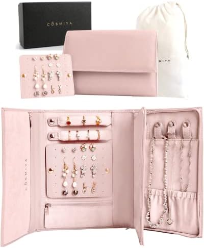 No More Tangled Necklaces – COSMIYA travel earring and necklace organizer features 5 dedicated compartments to keep all your treasures tangle free. A large removable panel for earrings, 4 looped clips and pockets for necklaces, 2 padded ring holders, 2 zipper pockets for watches, bracelets and small traveling accessories