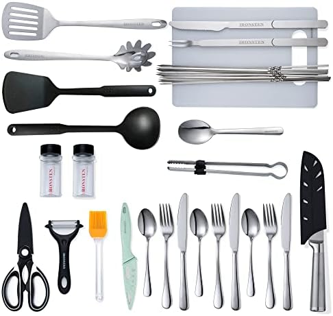 IRONSTEN Camping Cooking Utensils Set Camp Kitchen Equipment Portable Picnic Cookware Kit Bag Campfire Grill Utensil Gear Essentials Gadgets Accessories for RV Car, Tent Campers, Outdoor Picnics BBQ