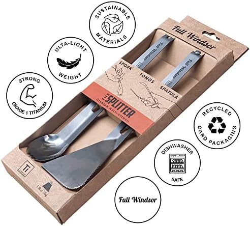THE SPLITTER Titanium Tongs, Spork and Spatula from Full Windsor – Portable Lightweight Metal Multi Utensil for Camp Kitchen, Backpacking, Travel, Outdoor Cooking, Camping Cookware, No Mess Eating Set