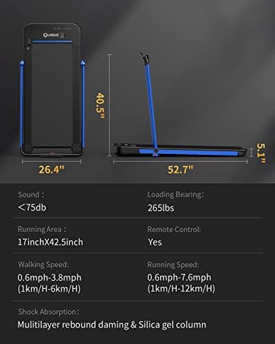 2.5HP Powerful Motor: With a powerful 2.5HP motor offering large load-bearing ability up to 265 lbs. The sturdy running machine allows you to run up to 7.6MPH with frame up and walk up to 3.8MPH under desk by the Remote Control.