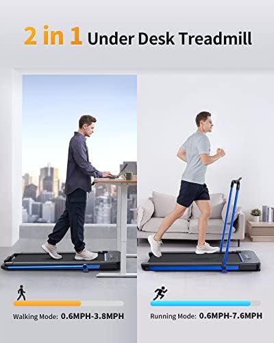 Non-assembly Design & Space Save Design: This 2 in 1 treadmill arrives fully assembled and can be used directly after unboxing. Foldable design and transportation wheels allow for easy mobility and portable foldable treadmill for storage, fold it up and walk away in one easy step, perfect for home , apartment, office use.